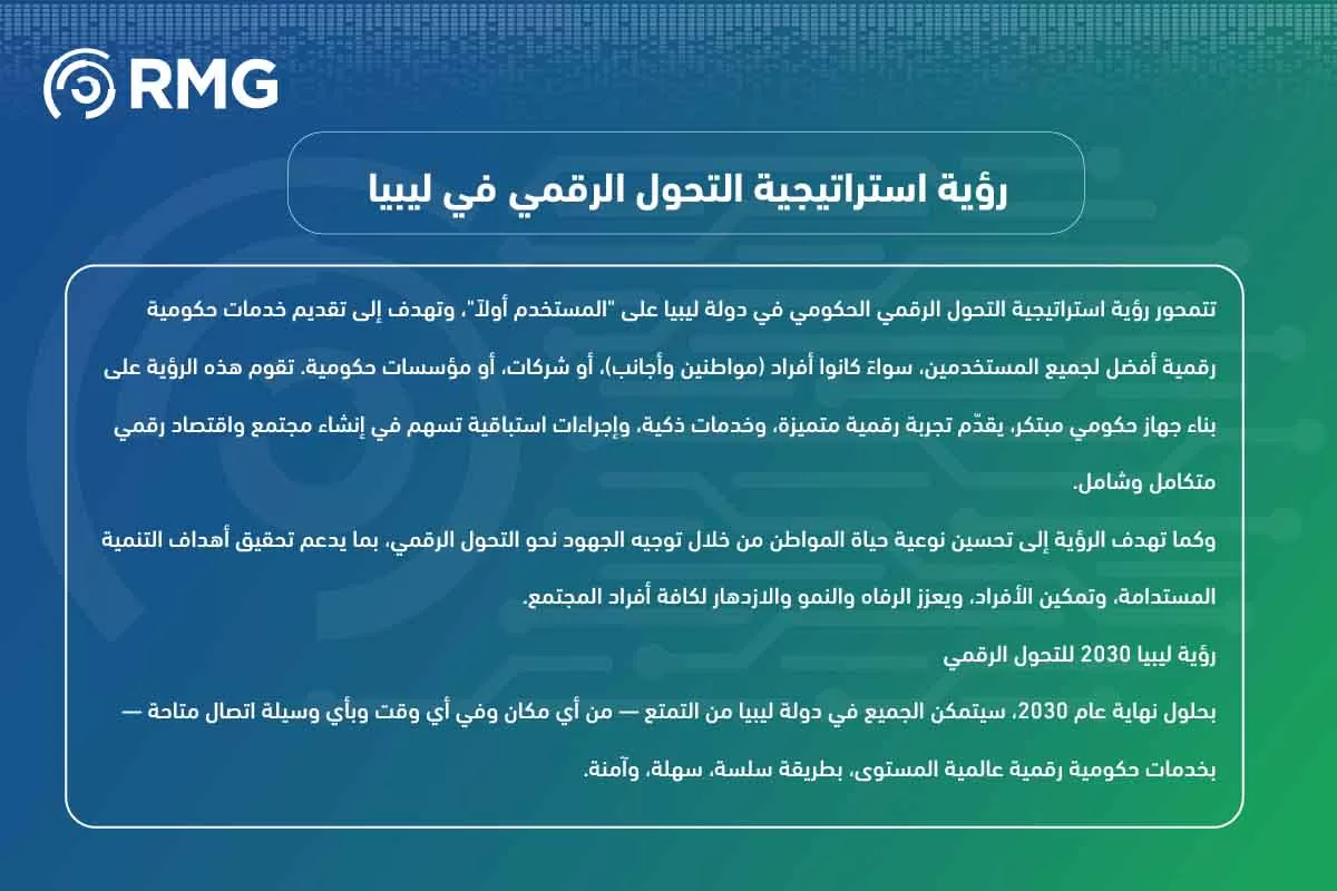 بحلول نهاية عام 2030، سيتمكن الجميع في دولة ليبيا من التمتع — من أي مكان وفي أي وقت وبأي وسيلة اتصال متاحة — بخدمات حكومية رقمية عالمية المستوى، بطريقة سلسة، سهلة، وآمنة.